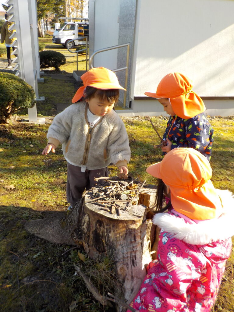 帰り道、公園で枯れた木の枝を拾って、切り株にのせ