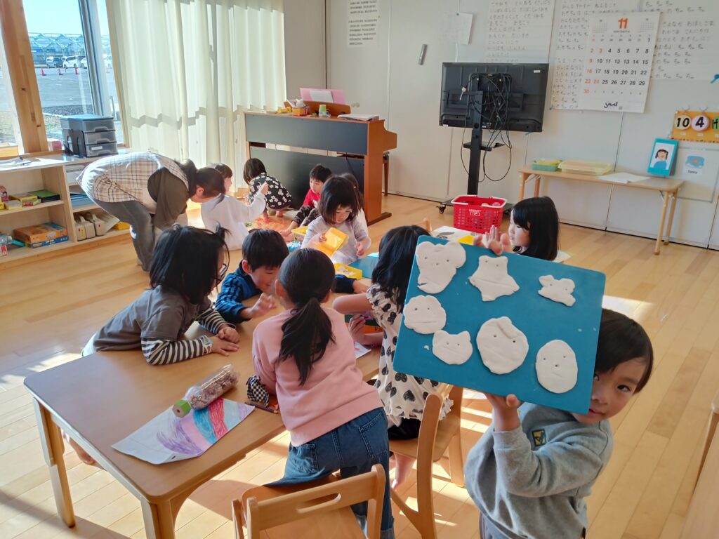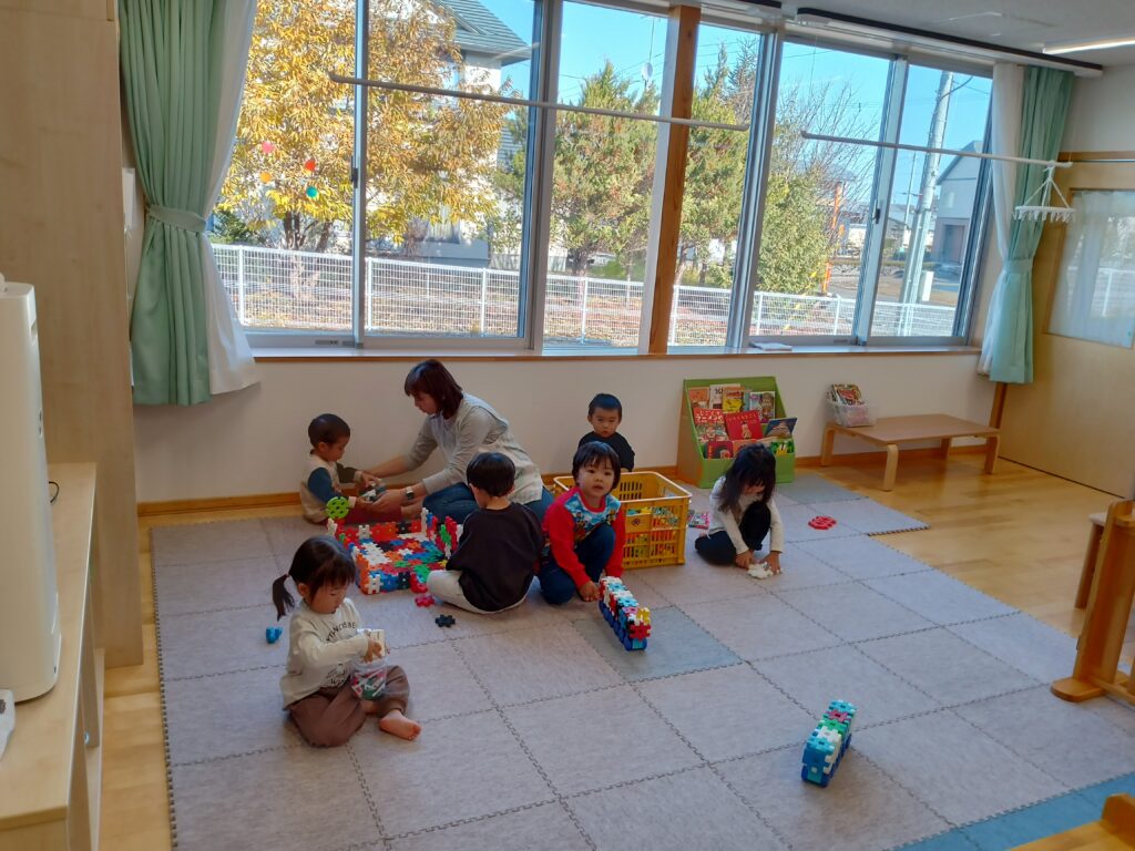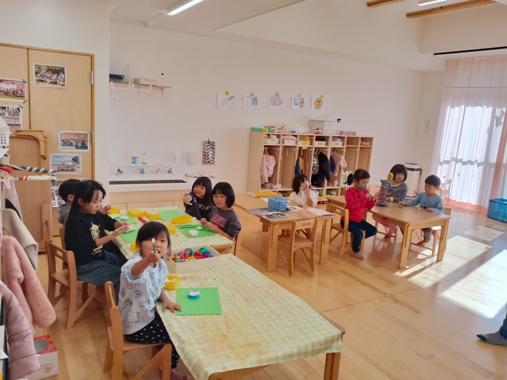 いつもより日差しがクラスを明るくして、その中子どもたちは、絵本を読んだり、ねんどやブロック、卓上ゲームをたたり、仲良く集中して遊びこんでいます。