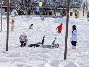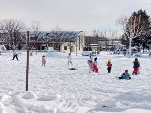 ようやく雪が園庭に積もり、子どもたちは早速雪遊びへ!