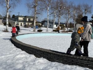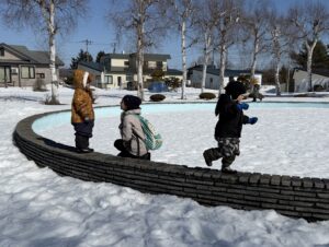 上手に作ったスキーやスケートは、結構滑って、時々転んでいましたが、