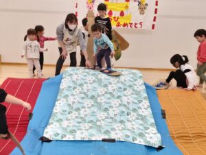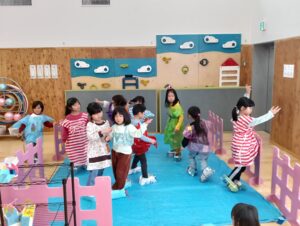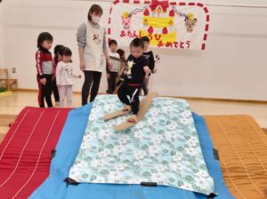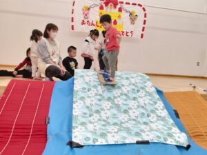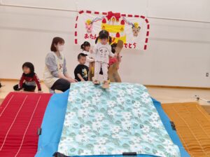 お遊戯室では、未満児さんも最後の競技を楽しみました。