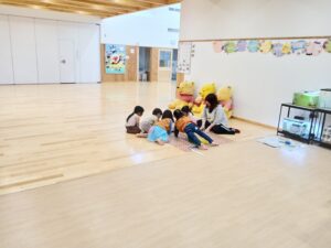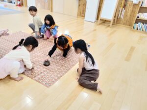 親しんでもらおうと、シートの上に置き、お遊戯室で遊んでいた子どもたちを呼びました。