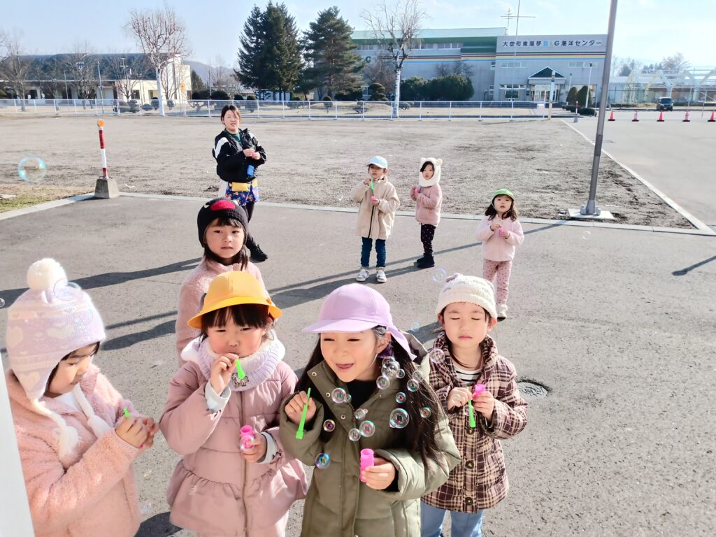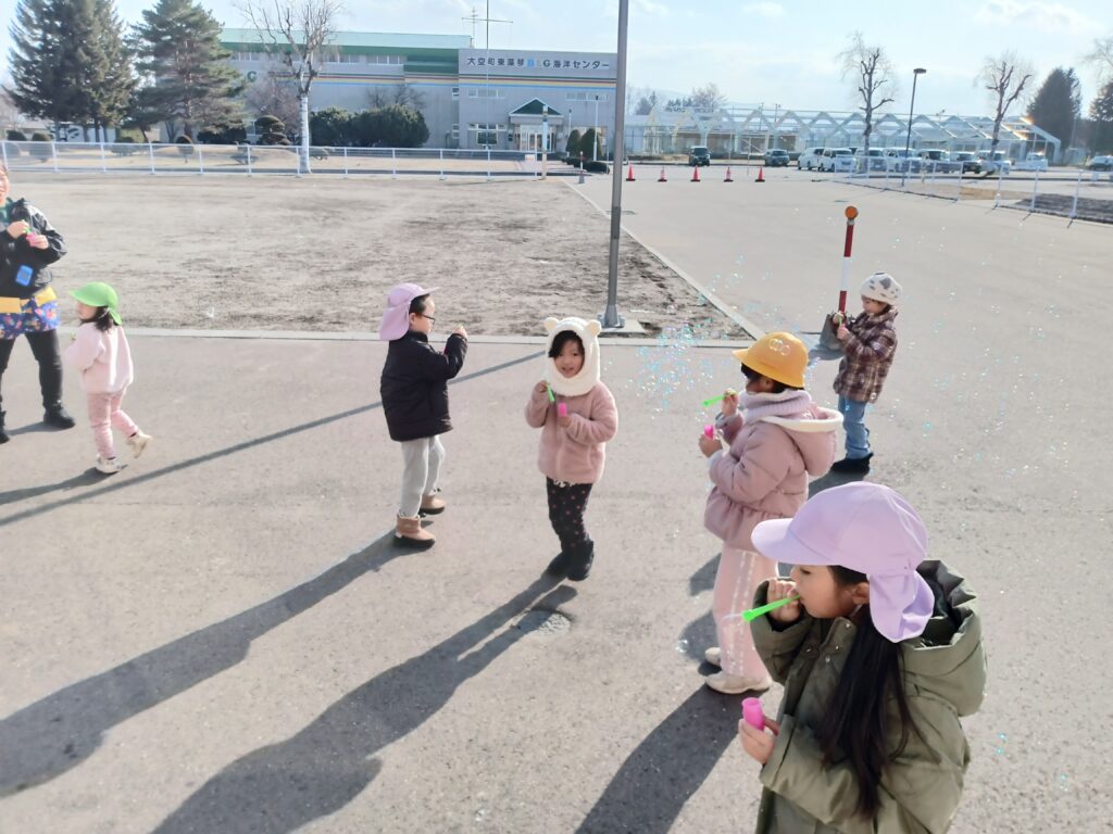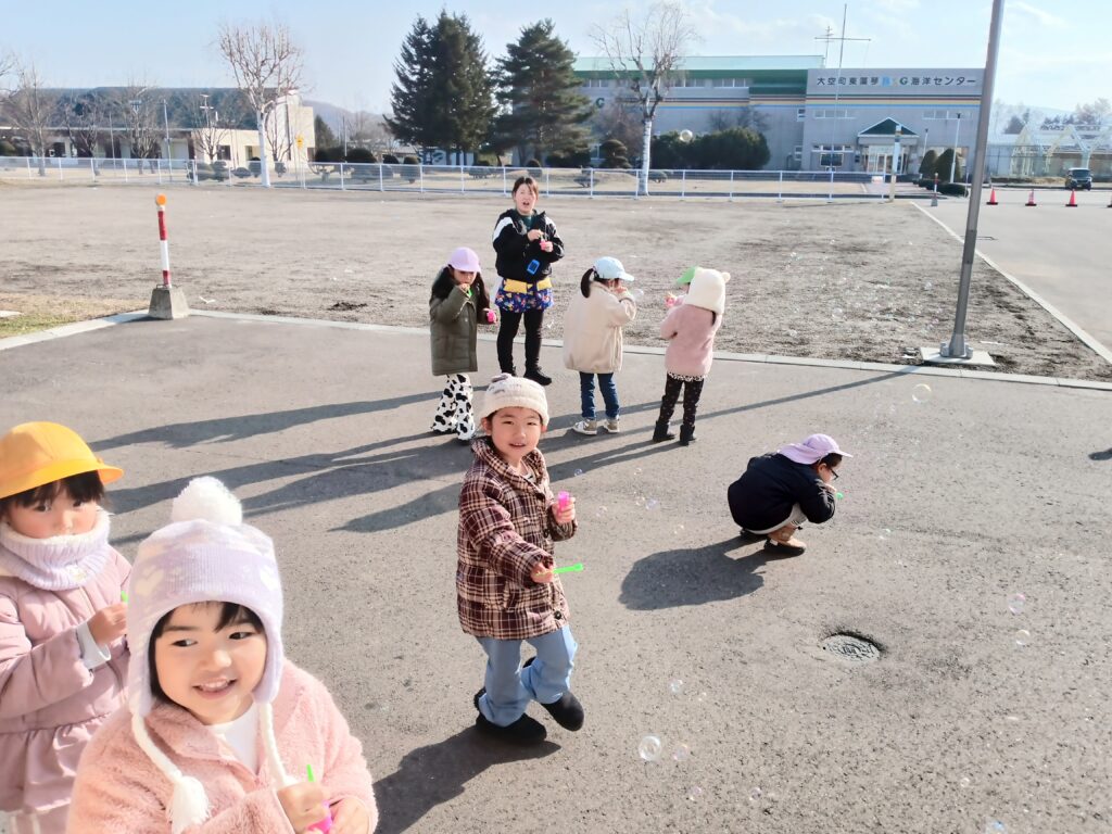にじ組のお友だちが次々とお外に出て、シャボン玉で遊んでいました。