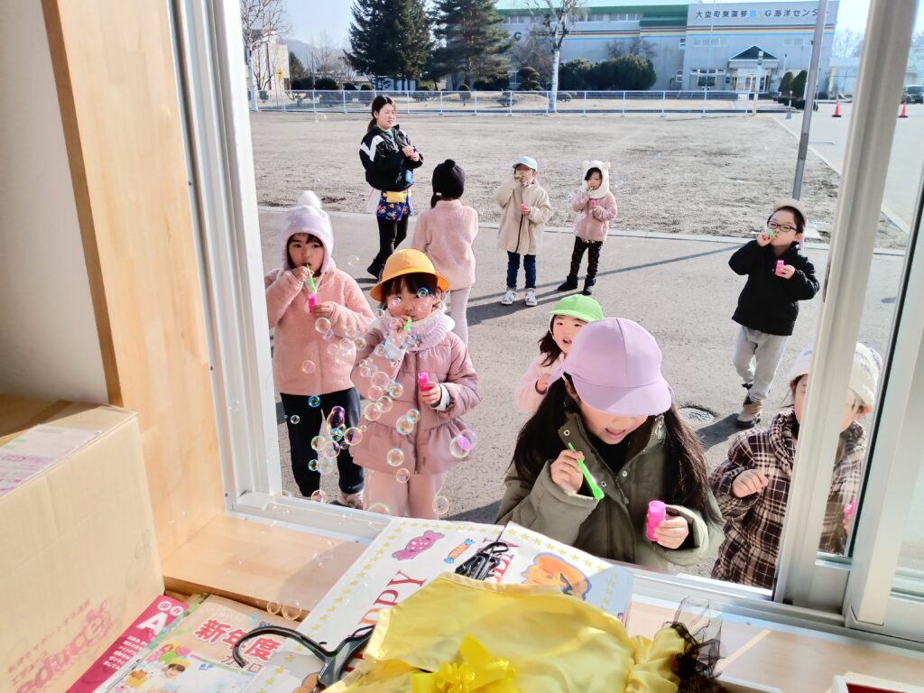 窓を開けて見ていると、シャボン玉を事務室に入れようと!